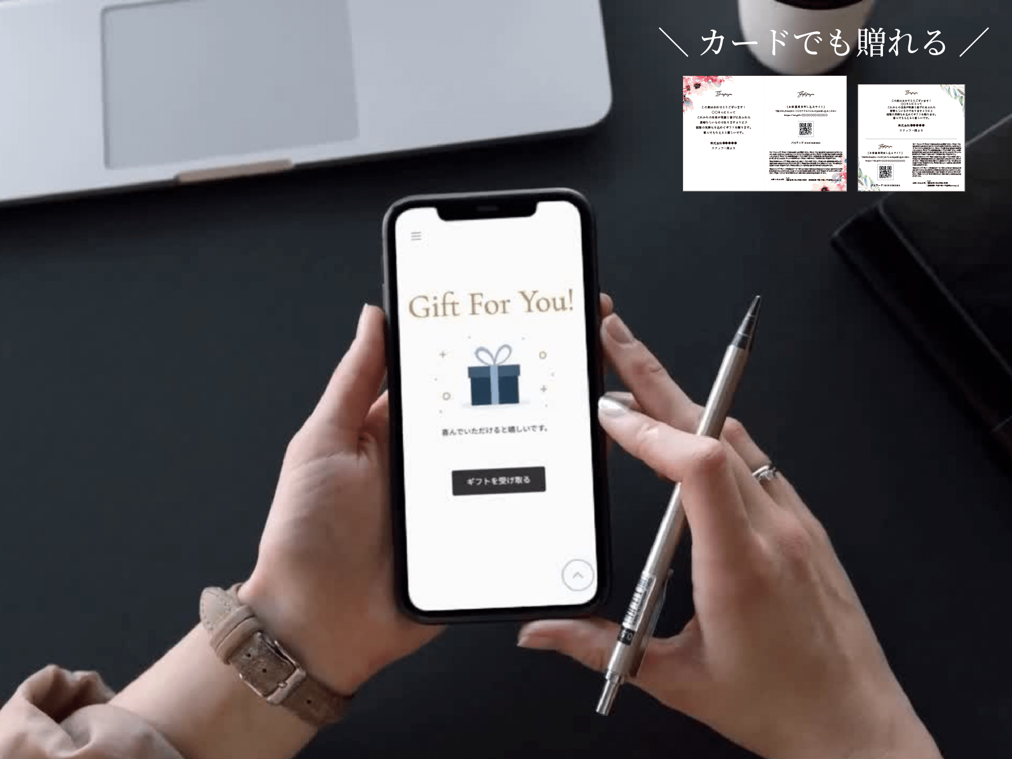 QRコードを記載したカードとしてお渡しすることもでき、社内イベントでの配布や対面での贈呈にも柔軟に対応できます。