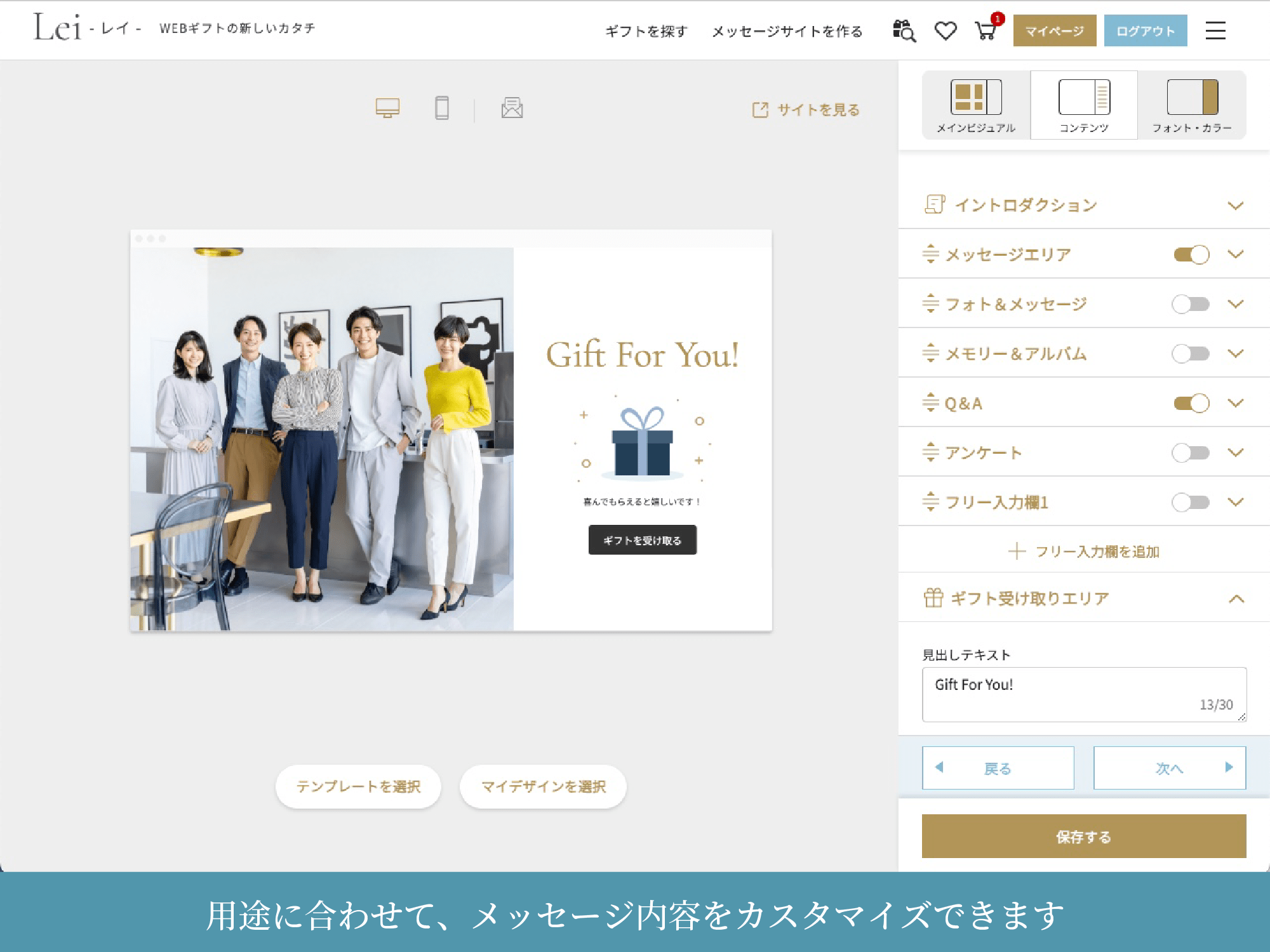 Leiでは、ギフトと一緒に専用のメッセージサイトを作成できます。テキストだけでなく、写真や動画を添えることも可能です。