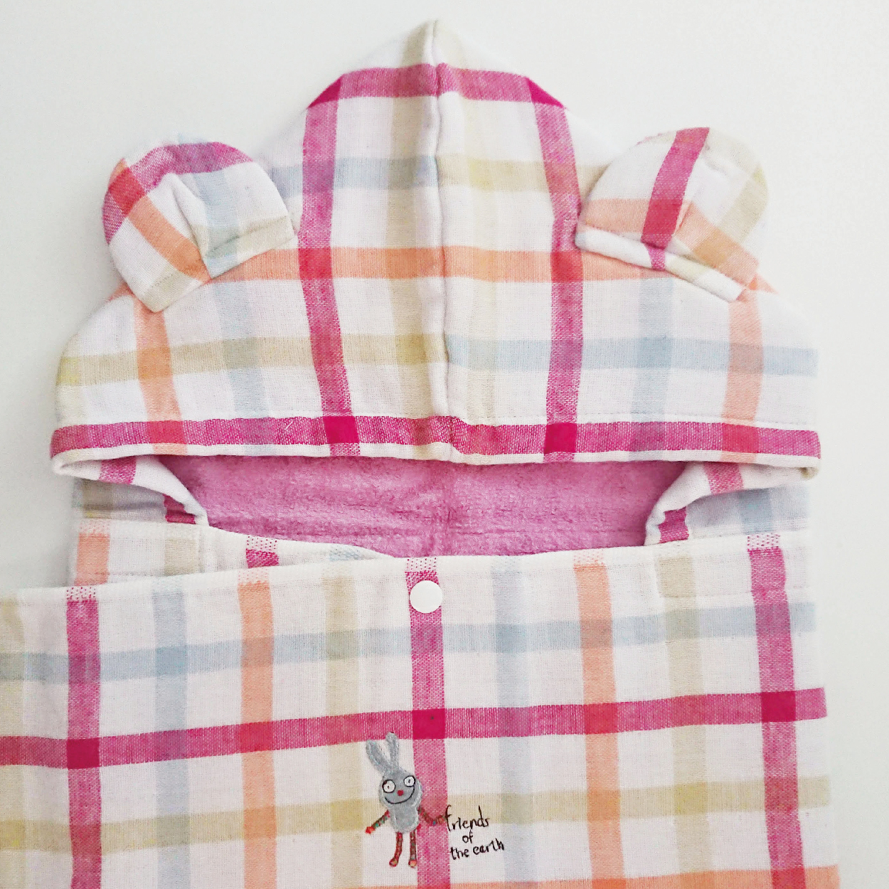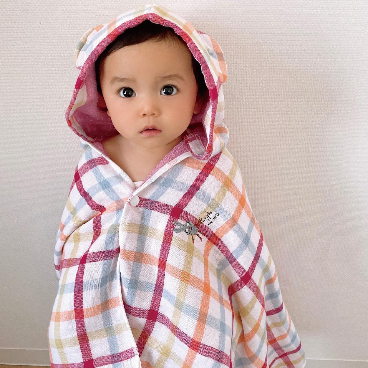 湯冷めしないように頭からすっぽりと被れるフード付きなので忙しいお風呂あがりはもちろん、新生児の時はおくるみに、大きくなったらプールや海水浴などの日除けにもお使いいただけます。新生児から小学生まで幅広い用途で大活躍してくれます。