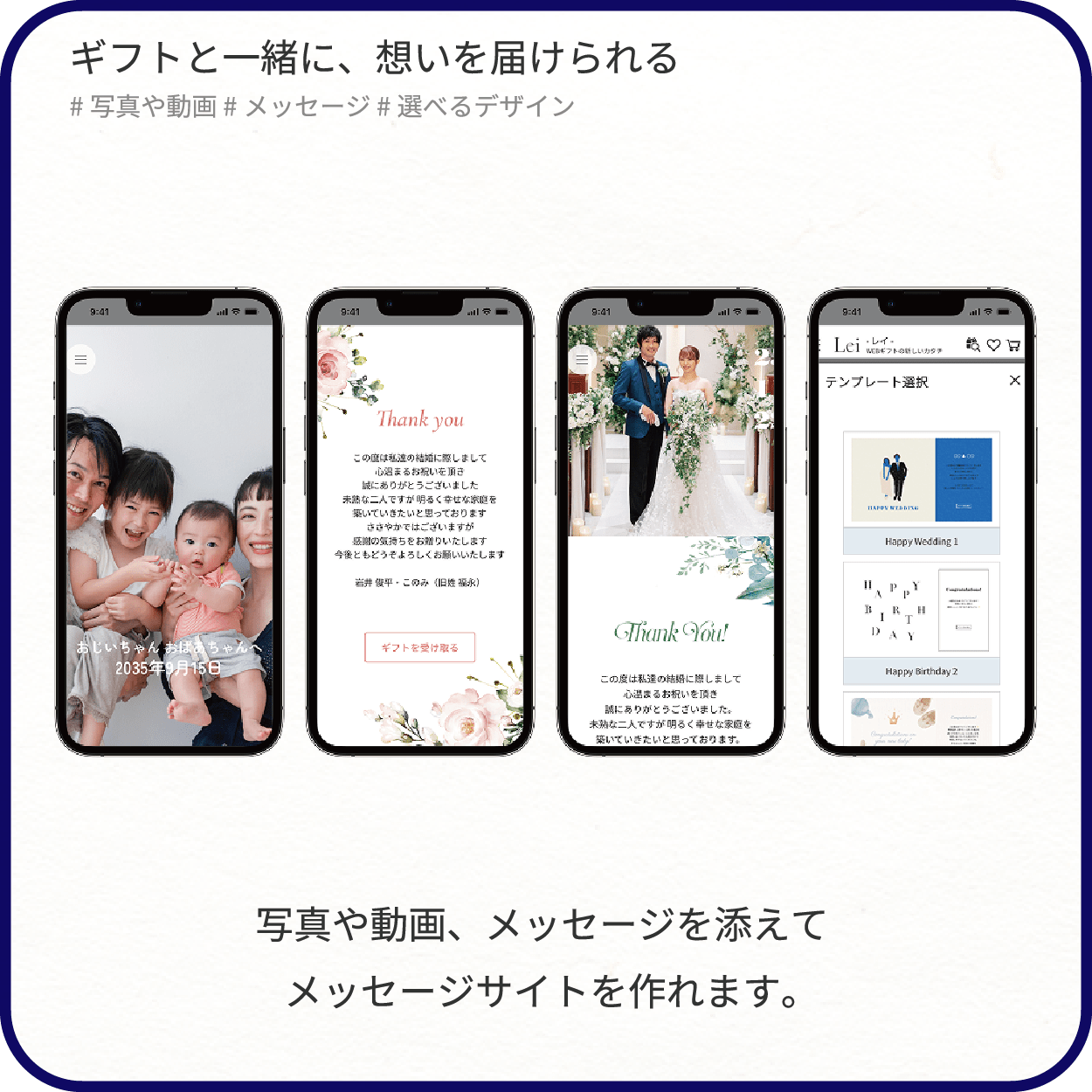 写真や動画・メッセージを添えた「メッセージサイト」と一緒に贈れるから、