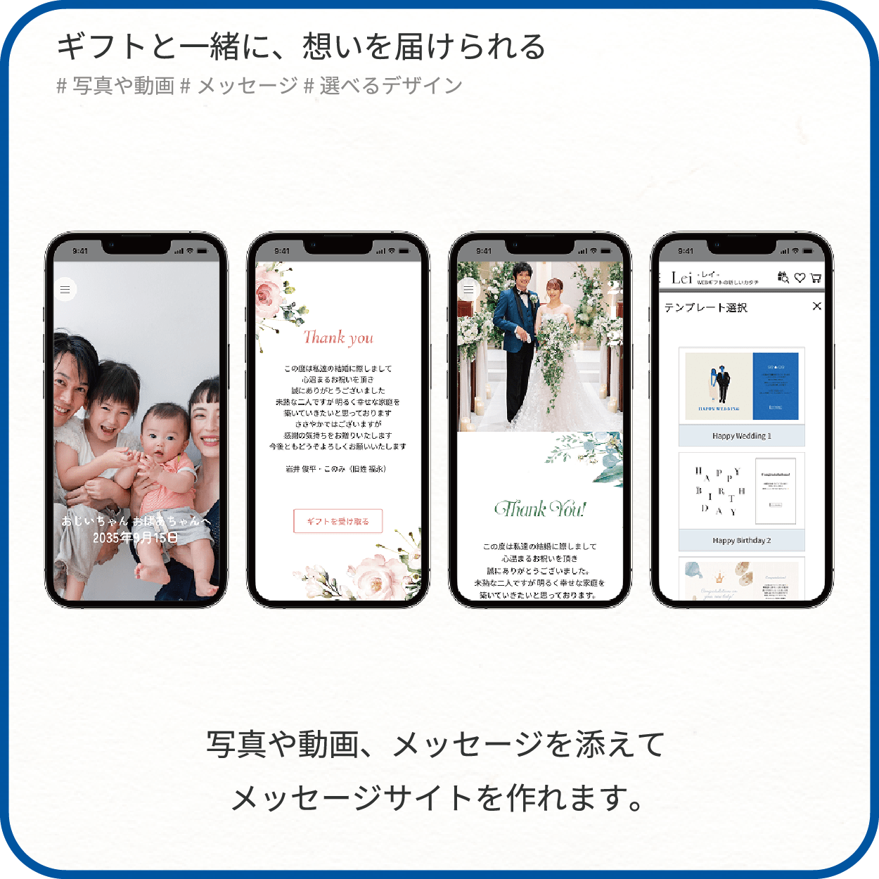写真や動画・メッセージを添えた「メッセージサイト」と一緒に贈れるから、