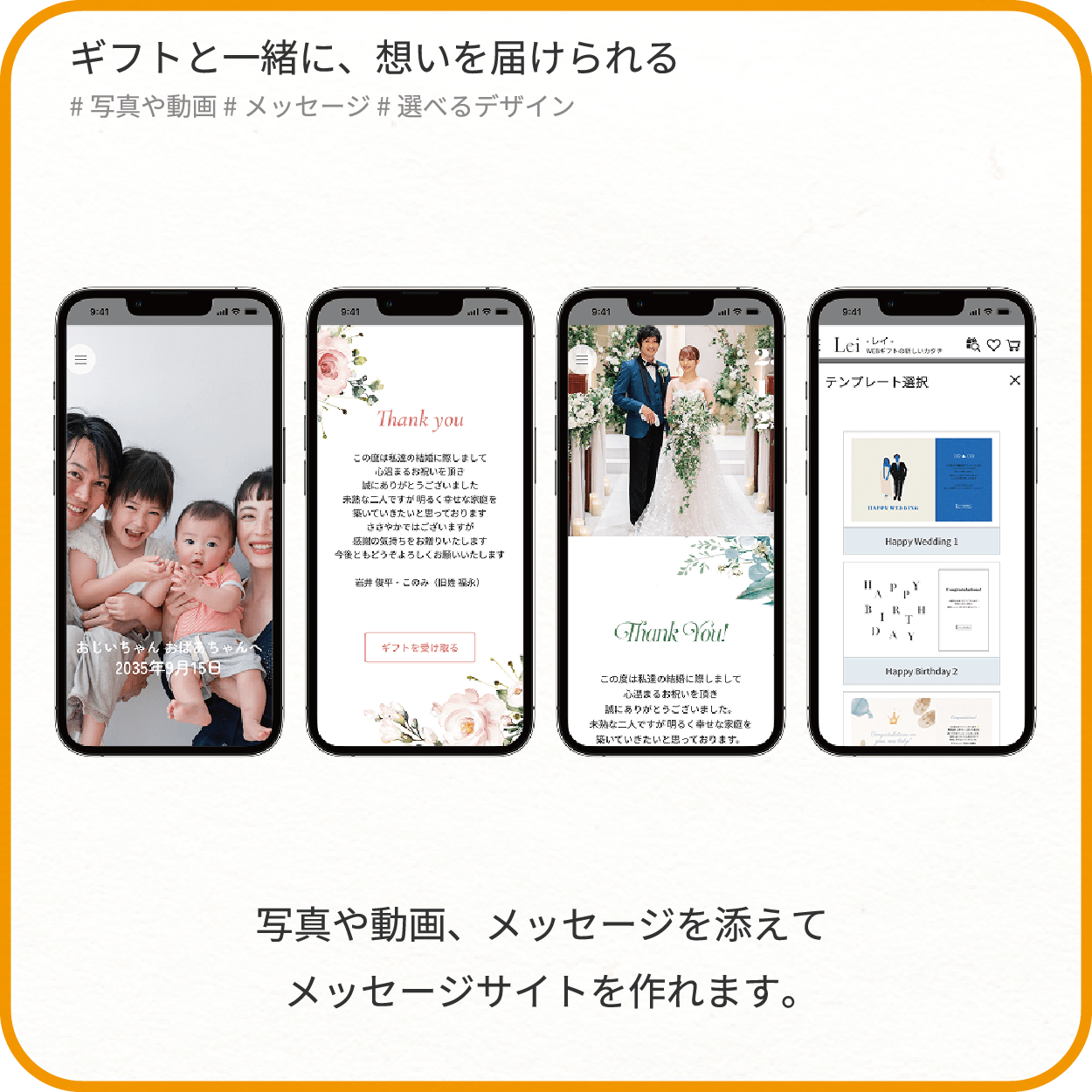 写真や動画・メッセージを添えた「メッセージサイト」と一緒に贈れるから、