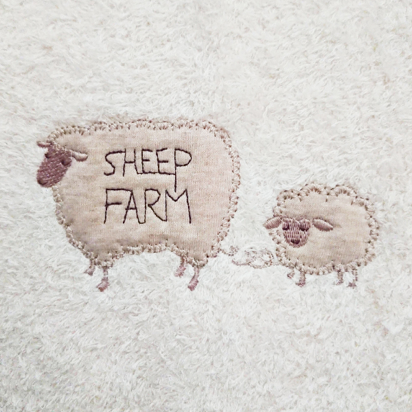 ブラウンはヒツジのたれ耳をイメージしてデザインしました。耳の内側はタオル繊維で織り上げたガーゼを使いソフトな肌触りに仕上げ、胸元にはモチーフに合わせたアップリケ刺繍を施し、前で留められるスナップボタンもデザインに合わせたカラーを使用しています。