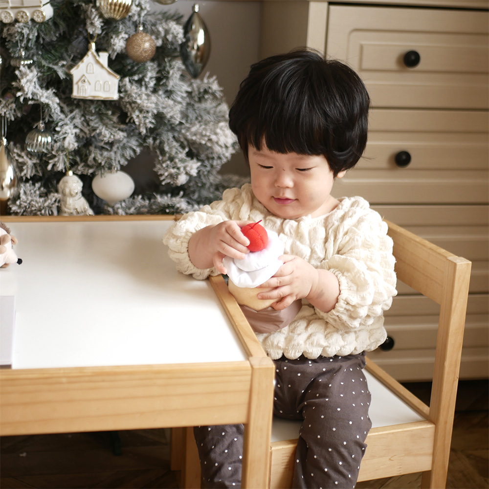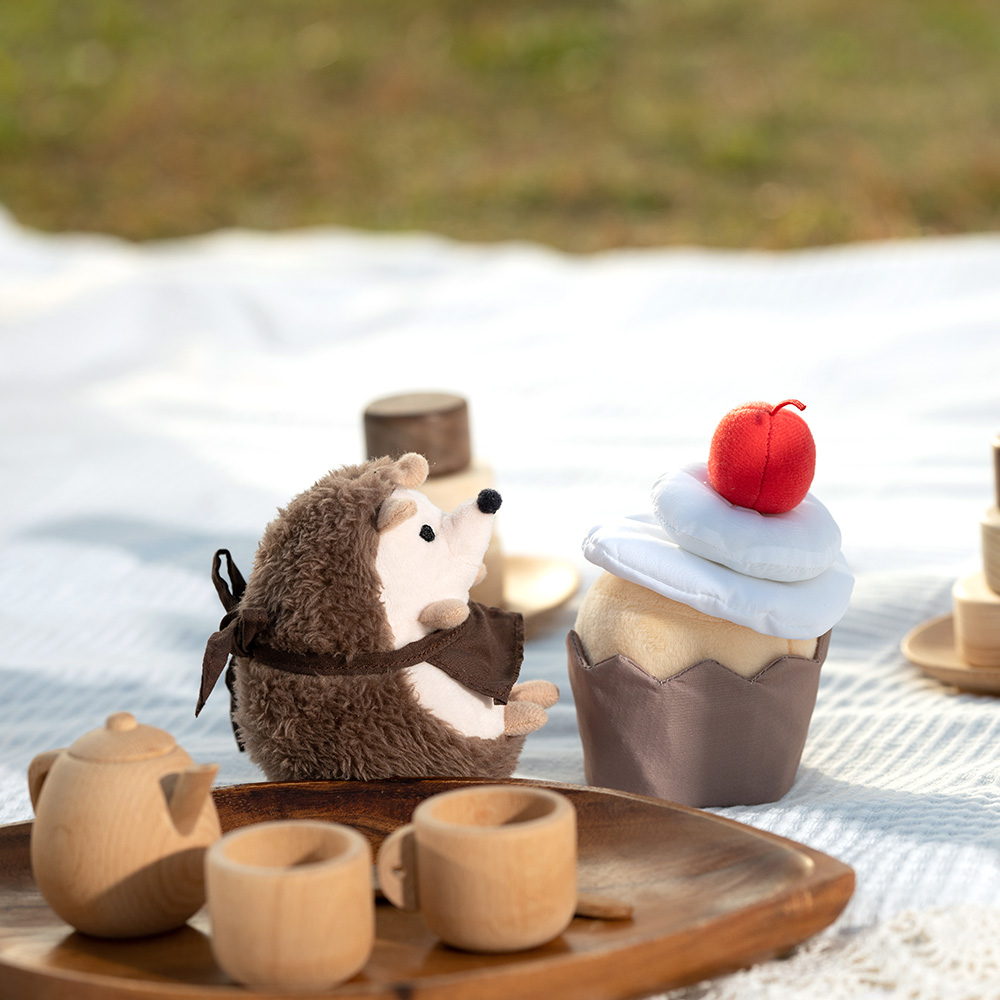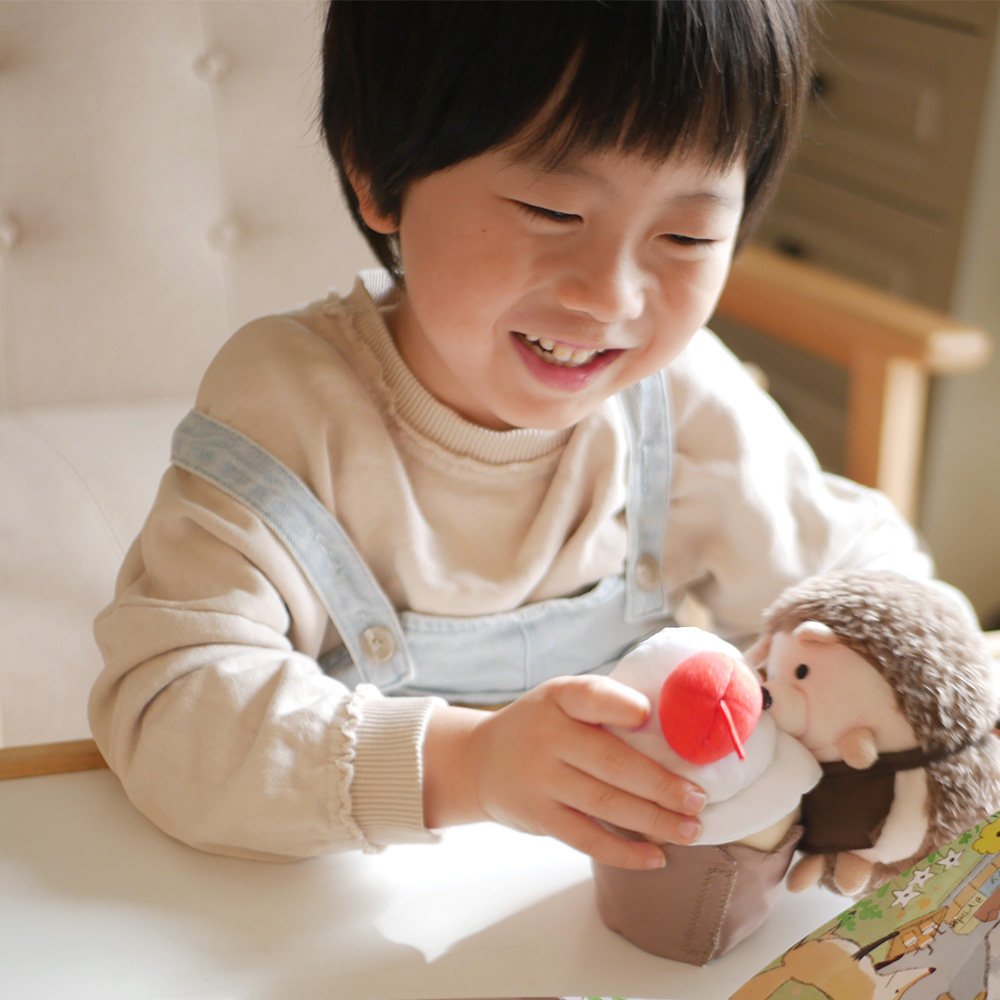 えほんに出てくるはりねずみくんのぬいぐるみと、みんなで作った美味しいカップケーキのおもちゃがセットになっています。 はりねずみくんのぬいぐるみは大人の手のひらサイズだから、ちいさなお子さまのはじめてのおともだちにも。 カップケーキはパーツが取り外し可能で、 パリパリ、カシャカシャと赤ちゃんの大好きな音が鳴ります♪ どちらも持ち運びやすいサイズなので、お外で赤ちゃんをあやしたり、少し大きくなったら一緒のおでかけも楽しめます。 素材もそれぞれ違うので、手触りを楽しむこともできますよ! ※誤飲防止のため、さくらんぼ・エプロンは取り外し不可能になっています