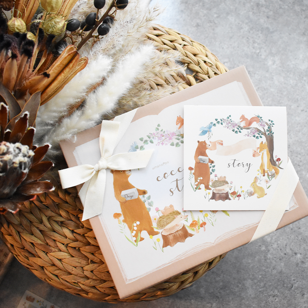 柔らかいアイボリーのリボンをかけてお届けするので、そのまま出産祝いやお誕生日のプレゼントとしてもお渡しいただけます。 また、動物たちが描かれた箱にも想いを込めています。 幸せを運ぶ青い鳥と言われるルリビタキや、思い出・幸福・希望などの花言葉を持つ植物をあしらい、物語の始まりのようなパッケージに仕上げました。
