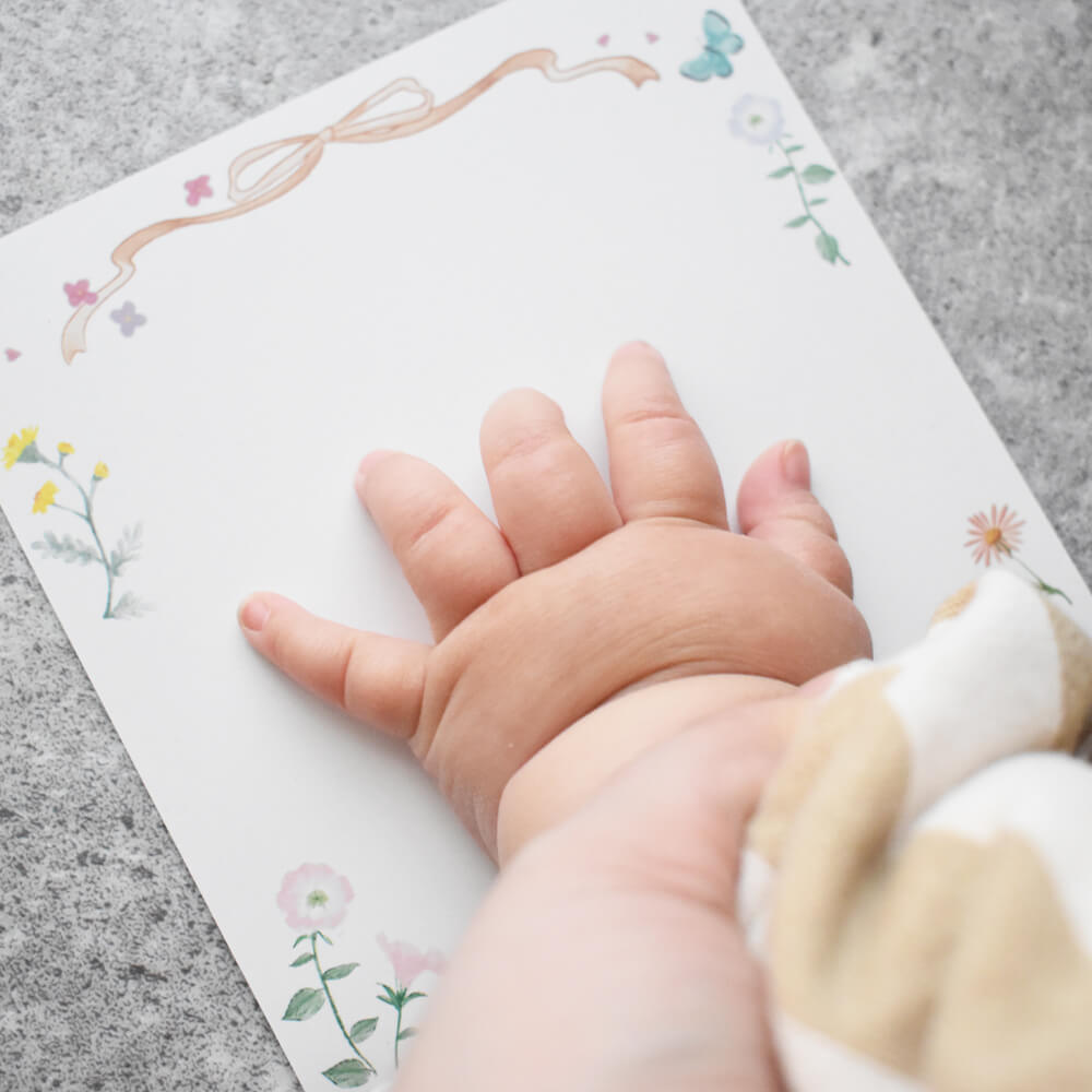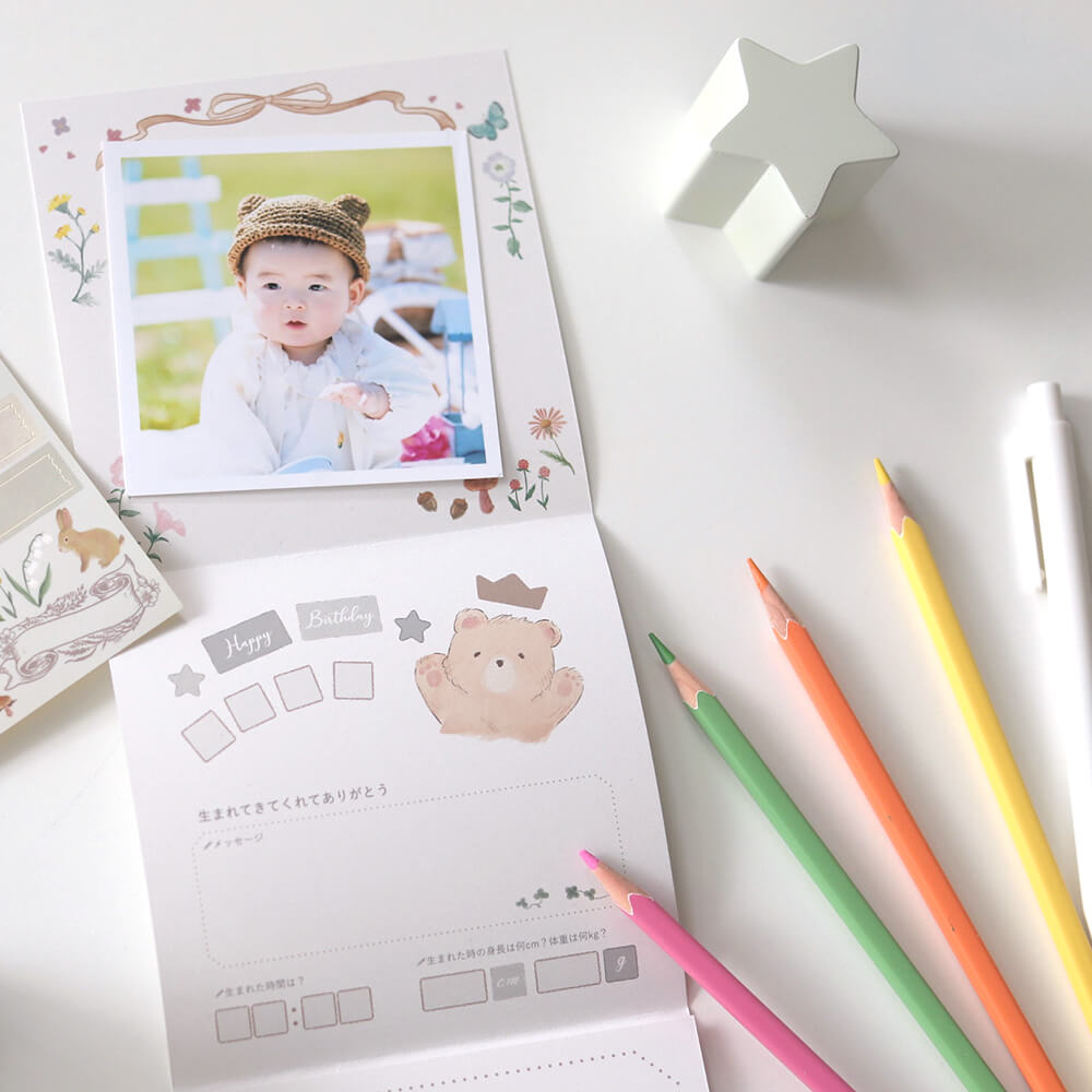 付属のリーフレットには手形や足形を押したり、写真を貼ったり、特別な思い出を記入して...あなただけの成長日記の出来上がり。 写真だけではなく、ママやパパの想い、お子さまへのメッセージも一緒に思い出に残してほしい...。 そして、10年後、20年後、今の気持ちを振り返ったり、「あのときこうだったよね」と時には家族の会話が弾むきっかけになればと思っています。