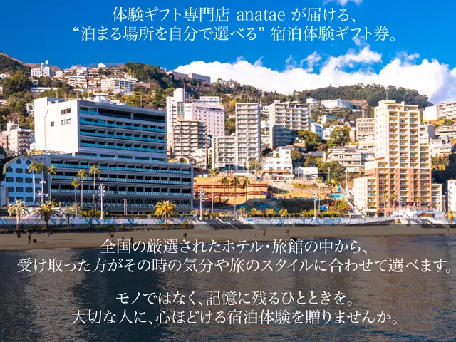 ■熨斗について ・熨斗をご希望の方はお問い合わせください。 ■ご予約について ・カタログギフトで予約可能な宿泊施設/お部屋タイプ/宿泊プランは、日時検索の結果に掲載のあるものだけです。宿泊施設/お部屋/宿泊プランの空室状況は、ホテルの公式サイトやそのほか旅行サイトで表示される情報とは必ずしも一致しません。 ・プランで選択可能である場合をのぞき、お部屋の指定はできません。 ・anataeは旅行業務取扱管理者の資格を有しており、その資格に基づき宿泊カタログを販売しております。また、宿泊予約はすべて、公式に提携している旅行予約システムサービスを通じて提供しております。 ・掲載中の宿泊施設は、予約状況など施設側の事情により、予告なく掲載を終了する場合がございます。万が一、特定施設の掲載が終了した場合は、別の掲載施設をお選びいただく形となりますことを、あらかじめご了承ください。 ■現地での支払いが必要なもの ・カタログギフトに含まれないもの:現地までの交通費、入湯税、宿泊税 ■体験ギフトの変更・アップグレードについて ・宿泊施設にご予約を入れた後、このカタログギフトを他の体験ギフトに交換・アップグレードすることはできません。 ■身分証明書の提示 ・宿泊時に身分証明書の提示を求められることがあります。 ■デポジット ・チェックインの際に一時預かり金の支払いが必要な場合があります。 ●食事について ・このカタログで予約可能なプランには、食事付きのプランと食事なしのプランがあります。食事なしの場合に追加でお食事サービスを利用できるかどうかについては、宿泊施設に直接お問い合わせください。 ■写真について ・写真はイメージです。実際と異なる場合があります。 ■収録内容について ・本カタログギフトを通じて予約できる宿泊施設・プラン等は予告なく変更となる場合があります。 ・無料Wi-Fi、コンシェルジュサービス、高級アメニティがほとんどの宿泊プランに含まれています。