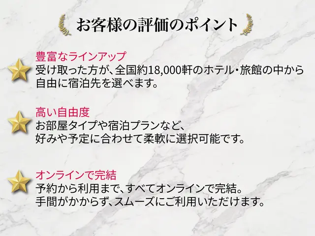 ・ゲストハウス函館クロスロード ・函館山ゲストハウス ・上ノ国ワイナリー ・旅館つかさ ・MONday Apart Premium 浜松町 ・コンラッド東京 ・日本色NIHONIRO ・ビジネス旅館福住 ・THESENSEFUJI ・河口湖アーバンリゾートヴィラ ・精進レークホテル ・料亭旅館金城樓 ・ひこそのまちやど ・marutto石川 ・LESTEL NAHA ・美らガーナハウス壷川 and more... !! 日本全国18,000以上のホテルから自由に選べるホテルギフトカード 予算に合わせて選べる『ホテルギフトカード』は、5,000円・10,000円・20,000円・30,000円の4種類をご用意。どの金額でも、全国約18,000軒のホテルから自由に宿泊先をお選びいただけます。 温泉旅館での癒しのひととき、シティホテルでの上質な滞在、リゾートホテルでの非日常体験など──大切な人に"心に残る旅"をプレゼントできます。
