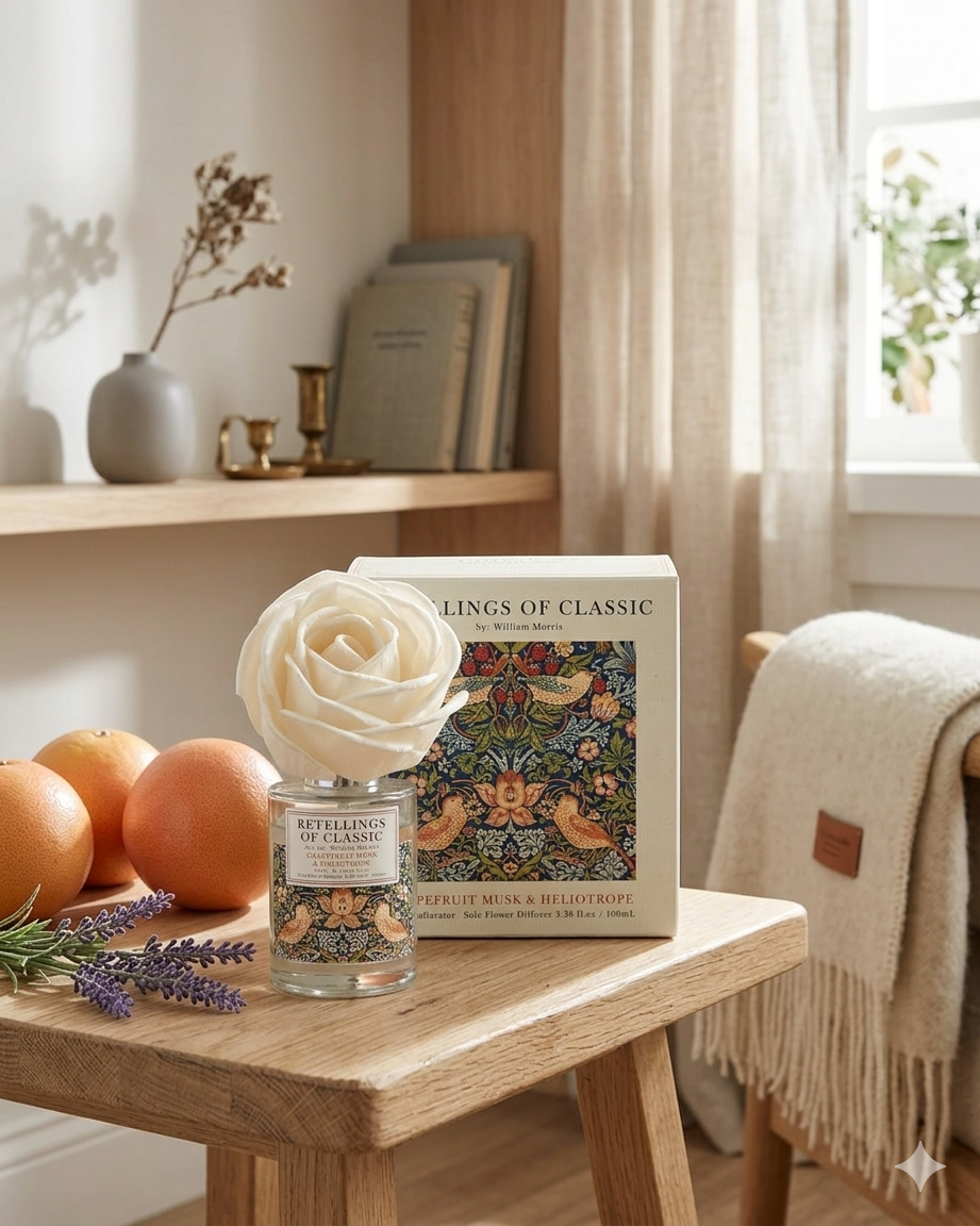 「モダンデザインの父」と称されるウィリアム・モリスの美しいボタニカルデザインをあしらった、フレグランスシリーズ。 ソラフラワーを使用したディフューザーは、空間にやさしく香りを広げながら、気になるにおいもやわらかく包み込みます。 爽やかなグレープフルーツの香りに、ほんのりと甘いヘリオトロープ(キダチルリソウ)の香りが重なり、 すっきりとした中にも落ち着きを感じる、心地よい香りに仕上げられています。 日常のひとときに、ふっと肩の力が抜けるような、やさしい時間を届けてくれます。 上質なデザインとやさしい香りは、大切な方へのギフトにもおすすめです。